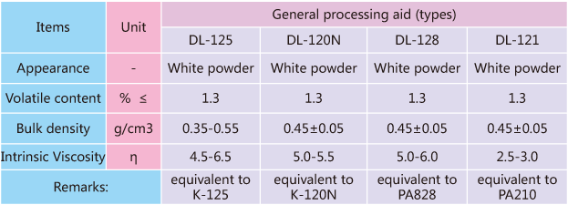DONGLINTM general processing aid are used to produce all kinds of opaque PVC products, such as PVC profile,PVC pipe,pipe fitting and PVC fencing etc.
