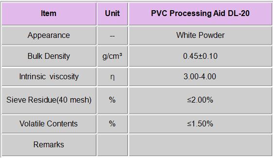 DonglinTM DL-20 developed by our R&D Center is a unique PVC processing aid, it is designed to improve the process property of rigid and flexible PVC formulations , in addition , DONGLINTM DL-20 has good flowability and dispersion , it can efficiently improve surface glossiness of PVC final products,it is used to produce all kinds of PVC products,especially for PVC transparent proudcs with high clarity needs owing to its faster fusion time and good flowability.