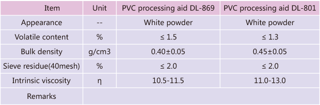 DonglinTM DL-801 AND DL-869 are special PVC processing aids basing on Poly(styrene-Acrylonitrile) developed by our company .comparing with general purpose acrylic processing aid,they have the higher molecular weight and viscosisty,they are designed by our company for cost-saving purpose owing to the balance of cost and performance.