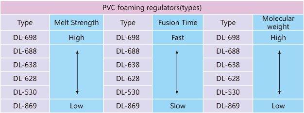 DonglinTM PVC foaming regulators developed by our company are actually acrylic processing aids and have all characteristics of acrylic processing aids. The only difference between them is that the molecular weight of foaming regulators is much more higher than that of acrylic processing aid.