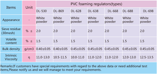 DonglinTM PVC foaming regulators developed by our company are actually acrylic processing aids and have all characteristics of acrylic processing aids. The only difference between them is that the molecular weight of foaming regulators is much more higher than that of acrylic processing aid.