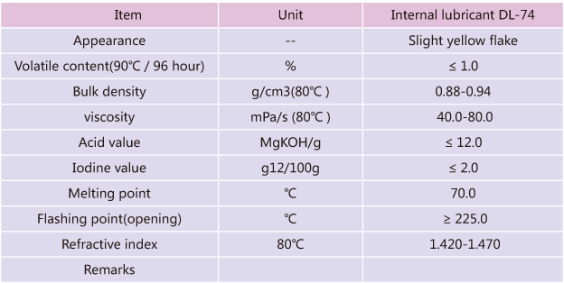 DonglinTM DL-74 developed by our company is actually a Multi-alcoholization fatty acid ester,it is white or slight yellow flakes and it is nontoxic and odourless,it can not be dissolved in water,but dissolves in tributyl phosphate(TBP)and chloroform,DL-74 has the excellent dispersion and transparency,it can be used to produce all kinds of PVC products as an external lubricant,especially for PVC clear products.