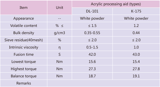 DonglinTM Lubricating processing aid DL-101 developed by our company is an acrylic polymer that functions as both an external lubricant and a processing aid in Vinyl. Its acrylic composition enables lubricating processing aid to provide external lubrication without imparting the incompatibility often found in Vinyl compounds containing conventional lubricants. Owing to its excellent metal release properties,it can effectively avoid adhesion between PVC melt and metal inner surface so as to avoid hot metal surface sticking and improve surface glossiness of PVC finished products.